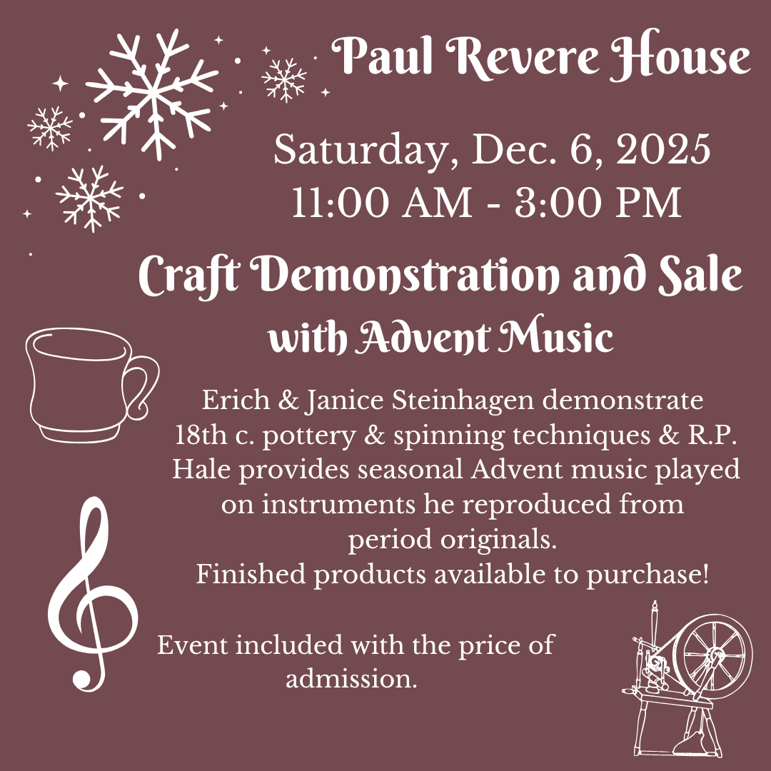 Erich and Janice Steinhagen bring their 18th century craft techniques all the way from Connecticut for a two-day holiday season residency as they demonstrate redware pottery production and the fiber art of spinning in our Revere Room. Erich will be throwing pots on the wheel while Janice spins sheep’s wool or flax into yarn. Finished products will be available for sale!