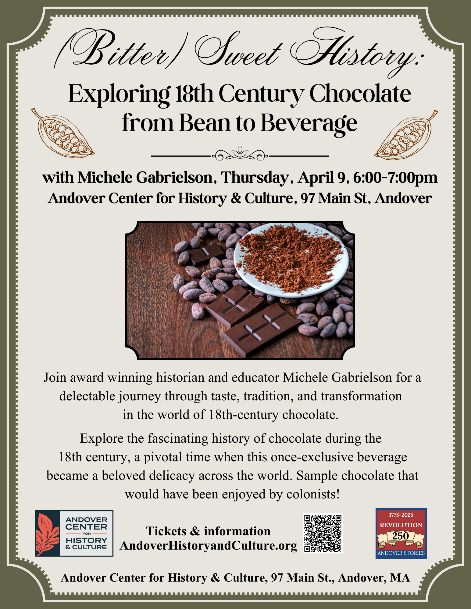 Join award winning historian and educator Michele Gabrielson for a delectable journey through taste, tradition, and transformation in the world of 18th-century chocolate. This interactive program explores the fascinating history of chocolate during the 18th century, a pivotal time when this once-exclusive beverage became a beloved delicacy across the world. We will examine the origins […]