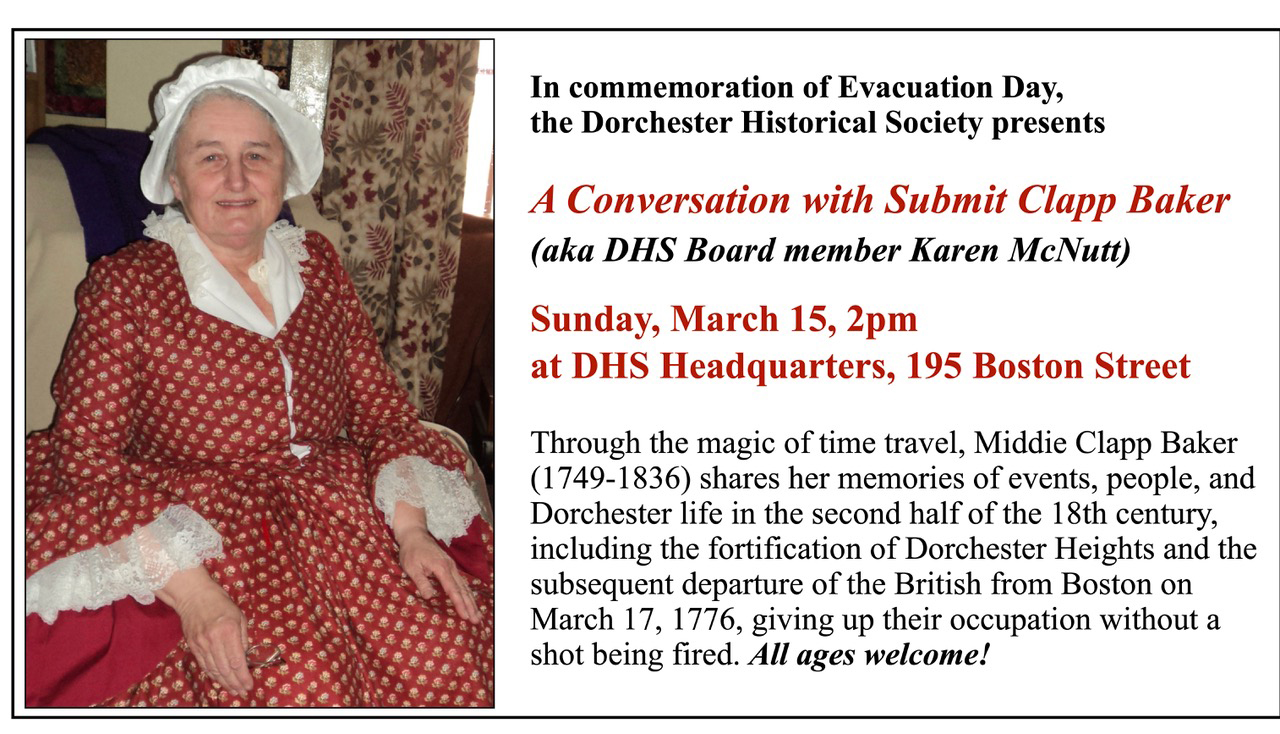 Through the magic of time travel, the Dorchester Historical Society welcomes Submit Clapp Baker, who lived from 1749 to 1836, and is portrayed by DHS board member Karen McNutt. Middie […]