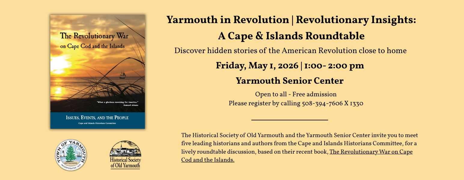 The Historical Society of Old Yarmouth and the Yarmouth Senior Center invite you to meet five leading historians and authors from the Cape and Islands Historians Committee, for a lively roundtable discussion, based on their recent book, "The Revolutionary War on Cape Cod and the Islands." Moderated by Steven Flack (Co-Chair HSOY Programs), we’ll explore […]