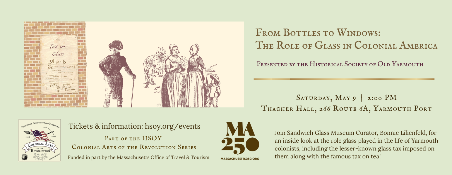 Join the Historical Society of Old Yarmouth and Sandwich Glass Museum Curator, Bonnie Lilienfeld, for an inside look at the role glass played in the life of Yarmouth colonists, including the lesser-known glass tax imposed on them along with the famous tax on tea!