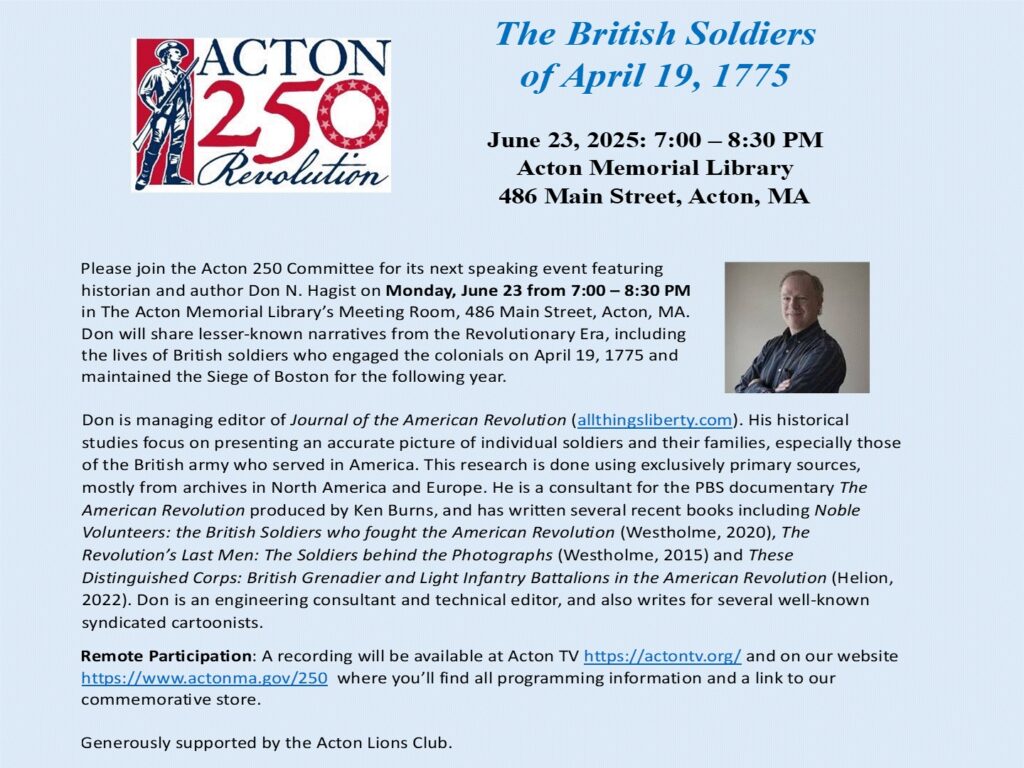 Please join the Acton 250 Committee for its next speaking event featuring historian and author Don N. Hagist on Monday, June 23 from 7:00 – 8:30 PM in The Acton […]